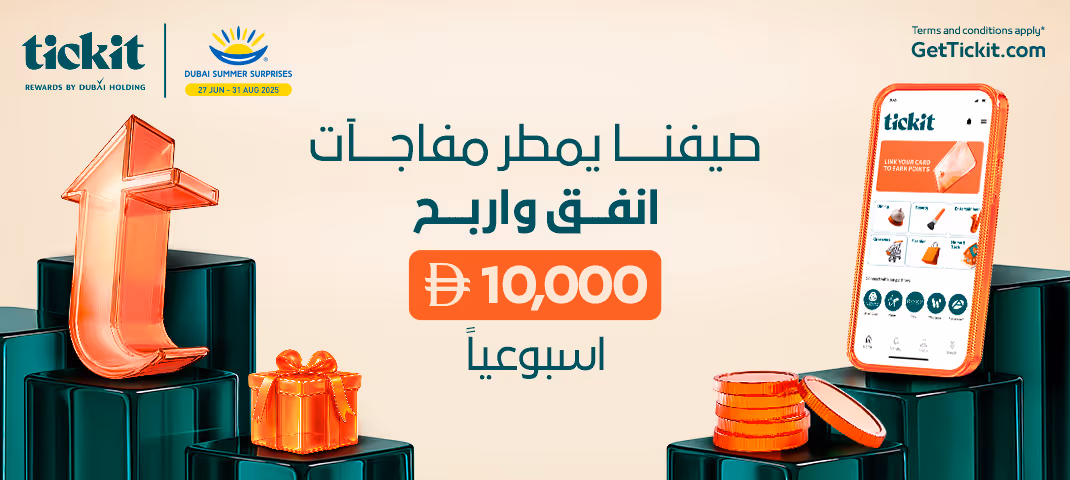 نتعاون هذا العام مع مفاجآت صيف دبي و"تِكِت" لنمنحكم فرصة مميزة للفوز. قم بعملية شراء واحدة في أي من وجهات "تِكِت" المشاركة، وقد تكون من بين خمسة فائزين محظوظين يحصلون على 10,000 نقطة تِكِت!
